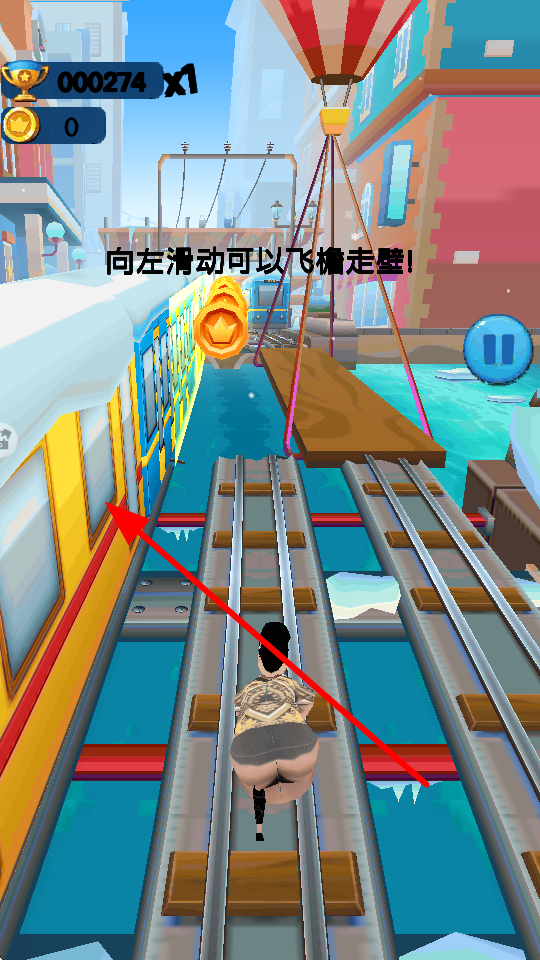 4、遇到可以飞檐走壁的场景时,按提示左右滑动,借助飞檐走壁,收集沿途的金币。