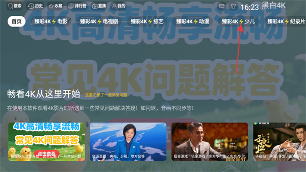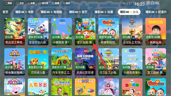 1、进入软件首页,点击臻彩4K少儿,进入少儿节目列表页面。