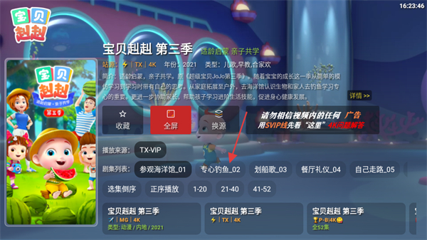 3、在宝贝赳赳第三季播放页面,选择剧集,如专心钓鱼02,点击开始播放。