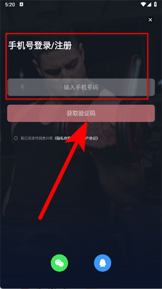 3、在手机号登录注册页面,输入手机号,勾选后,点击获取验证码。