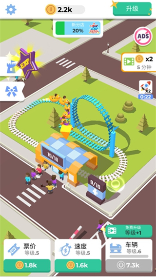 3、吸引更多顾客乘坐过山车,当顾客数量达到一定程度,点击升级按钮屏幕右上方对过山车设施进行升级。