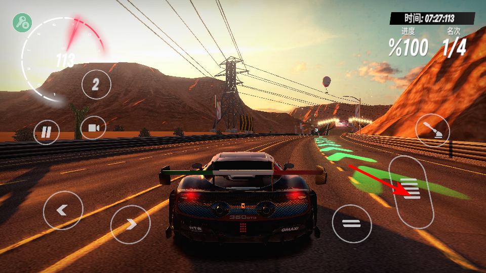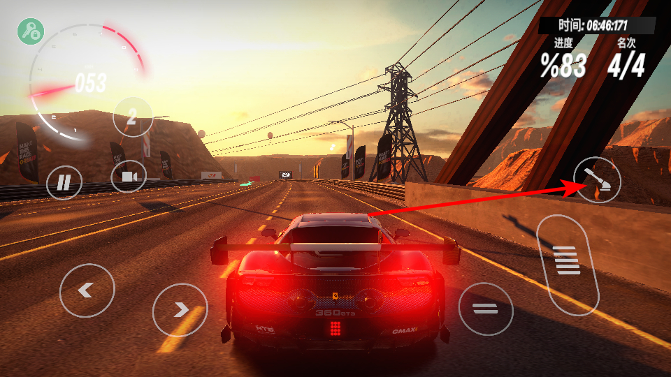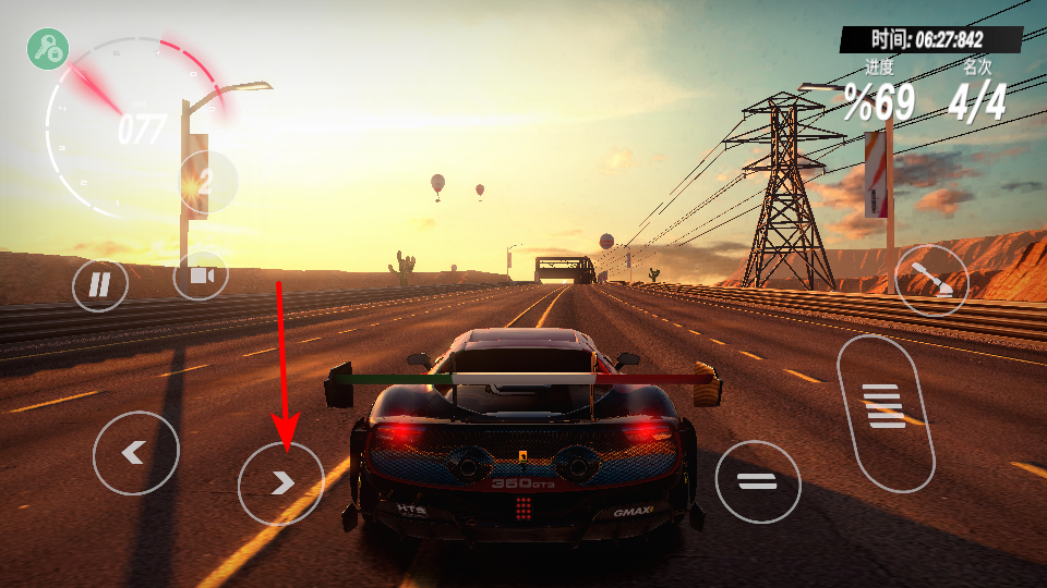 2、先按下方向键如右方向键调整赛车方向,控制加速按钮,让赛车产生侧滑趋势,进入漂移状态。