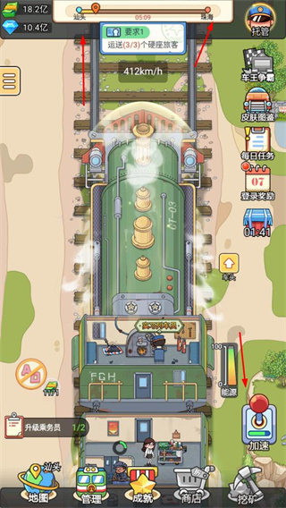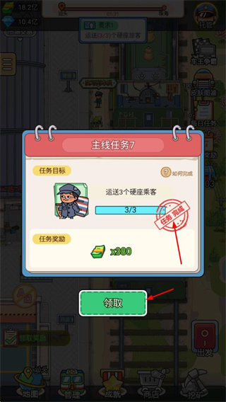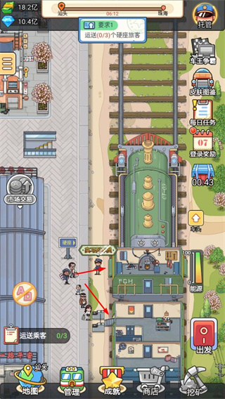 1、在游戏场景中,可管理车站,运送乘客,界面会显示运送乘客的任务进度,点击出发按钮让列车出发。