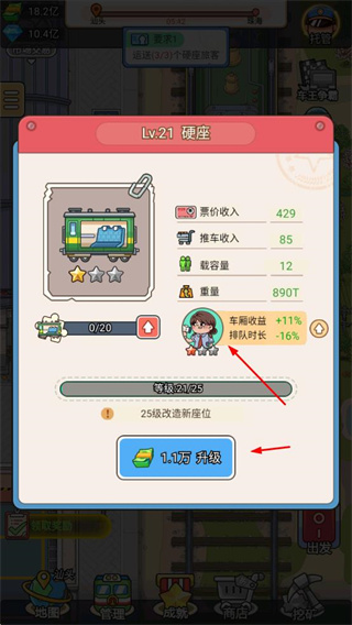 2、可对列车车厢进行升级,消耗资源提升车厢的票价收入、推车载入、载客量等属性,还能减少排队时长。