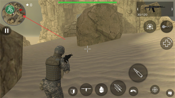 1、通过左下方虚拟摇杆移动角色,参照小地图寻找敌人方位。