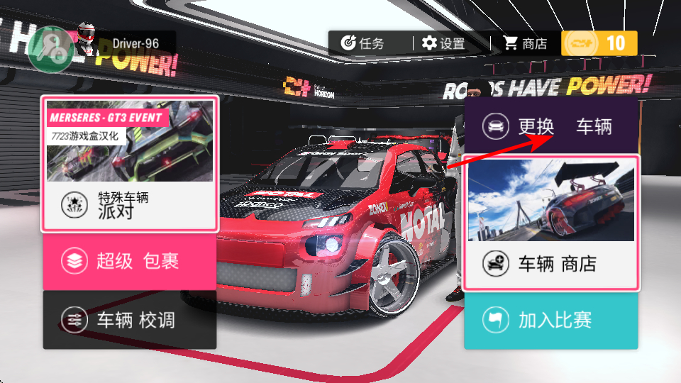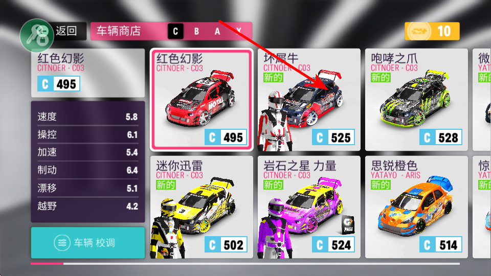 4、在车辆商店或选择界面中,确认选择目标车辆如坏犀牛,完成车辆切换,即可驾驶该车辆参赛。