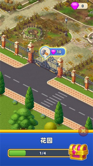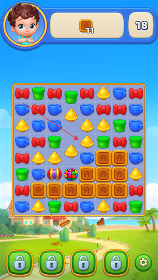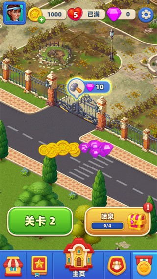 以经典三消闯关为核心驱动力,消除关卡中匹配不同元素可获得木材、砖石、金币等建设资源,资源直接用于度假村的建筑解锁与升级,形成闯关-获资源-建度假的闭环玩法。