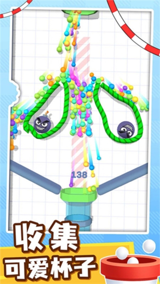 3、画好线后,让球体顺着线路滚动,使其落入杯子中。
