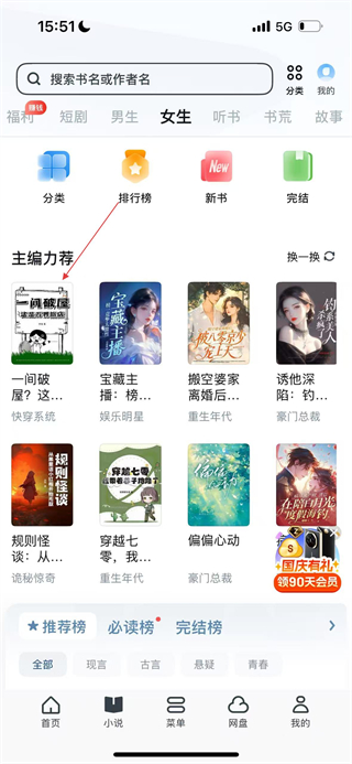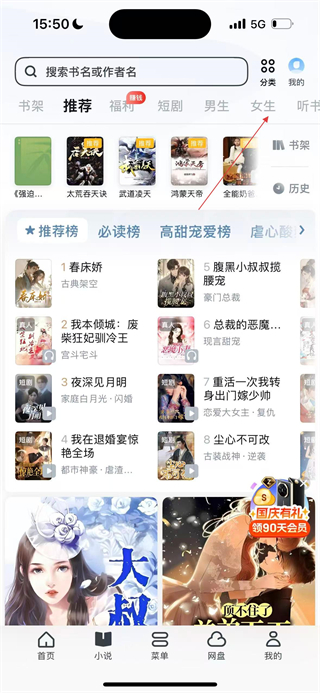 2、在小说页面,点击女生,进入女生小说推荐页面。