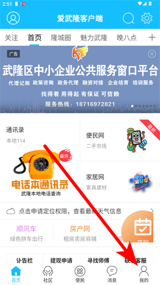 1、打开爱武隆,点击底部我的。