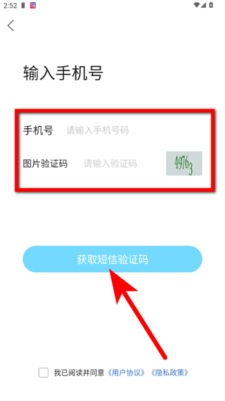 3、填写手机号和图片验证码,勾选后,点击获取短信验证码。