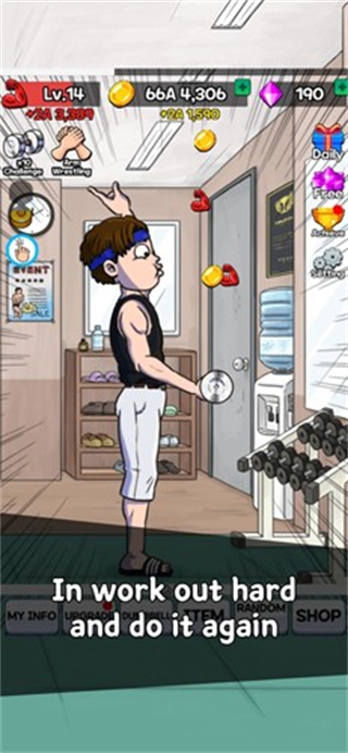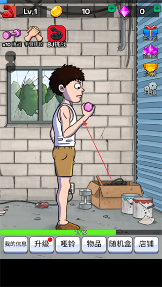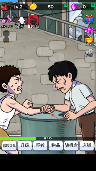 2、使用金币如初始的10金币,点击升级按钮,提升角色掰手腕的能力。