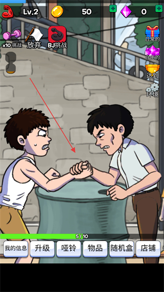 4、在掰手腕过程中,按照游戏提示操作,争取压制对手,获得胜利,完成任务目标如5/10。