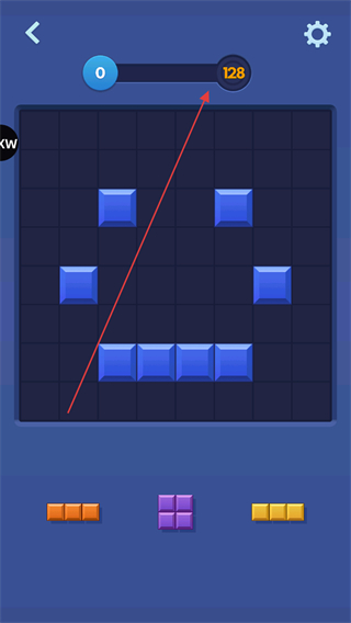 1、进入游戏,查看界面上方进度条如0-128,明确目标分数,观察下方不同形状的方块。