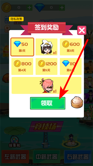 1、每日记得点击签到,在弹出的签到奖励界面点击领取,可获取钻石、金币等奖励,这些奖励能用于提升武器或解锁内容,助力游戏进程。