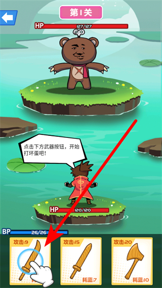2、进入游戏后,可点击开始游戏,在关卡中,依据提示点击下方武器按钮,使用对应武器攻击对手,不同武器有不同攻击效果与耗蓝,需合理选择。