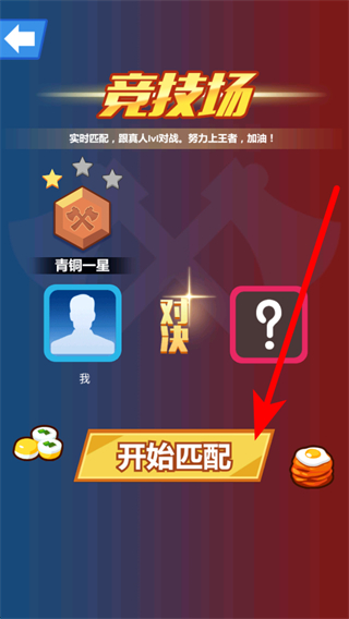 4、若想与真人玩家竞技,可点击竞技场,进入后点击开始匹配,匹配成功即可与其他玩家展开实时对战,努力提升段位能获得更多乐趣。