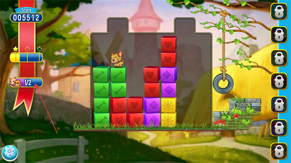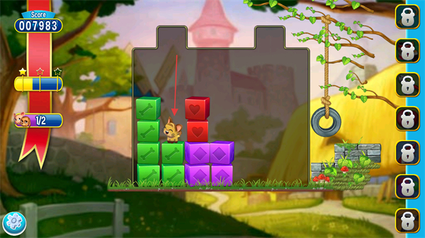 3、利用消除方块产生的空位,让小猫逐步向下移动,注意消除顺序和策略。