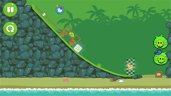 3、利用场景地形如斜坡,让载着猪的木车顺势下滑,途中注意躲避障碍,使猪顺利前进。