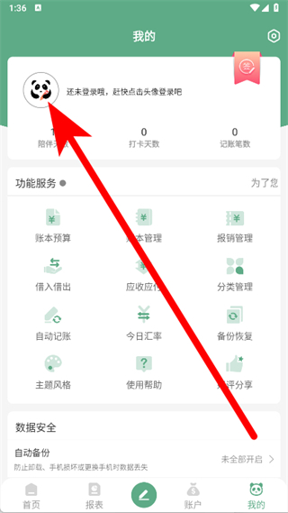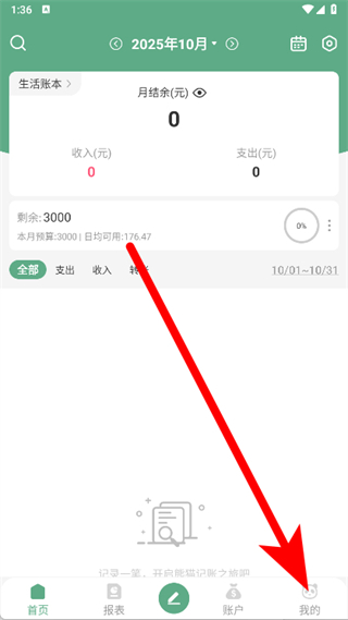 1、打开熊猫记账,进入主界面后,点击底部导航栏中的我的选项。