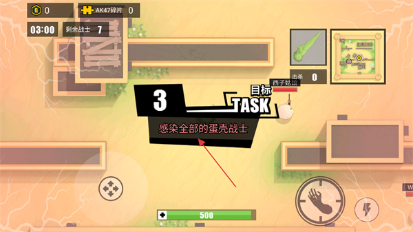 1、游戏开始,查看屏幕上方信息,明确目标为感染全部的蛋壳战士,记住剩余战士数量如7和倒计时如03:00。