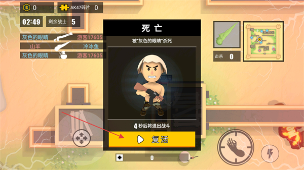3、战斗中若被击杀,出现死亡提示,点击复活按钮重新加入战斗。
