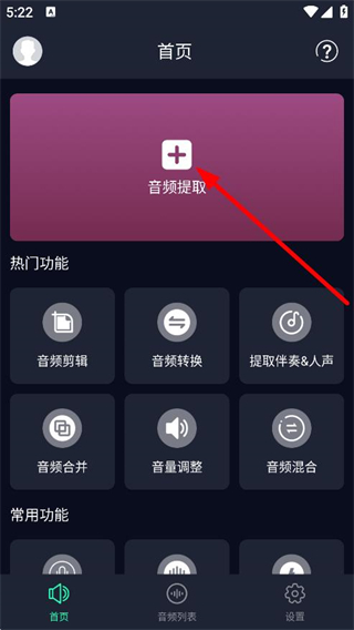 1、在音频处理APP首页,点击音频提取,进入视频选择页面。