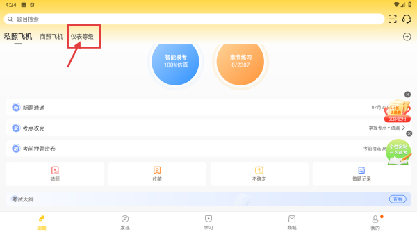 1、打开航空仪表等级考试学习应用,点击仪表等级分类选项,进入仪表等级学习页面。