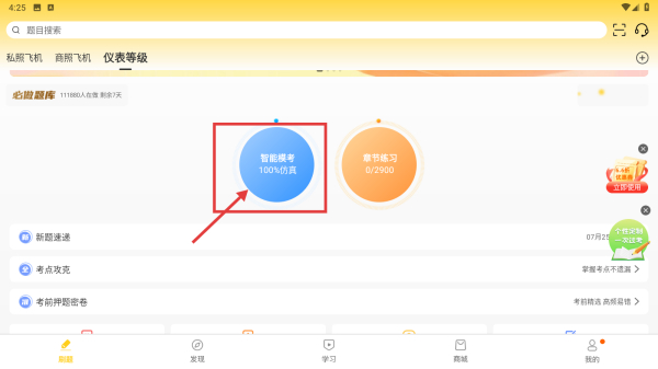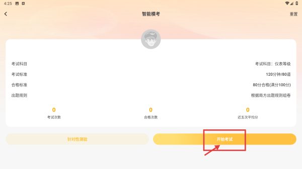 2、在仪表等级学习页面,选择智能模考板块,进入模考准备界面。