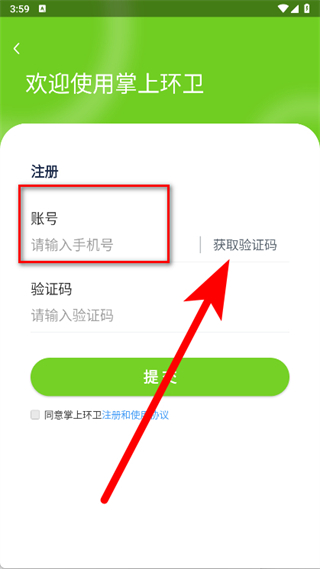 3、在注册页面,输入手机号,接着点击获取验证码。