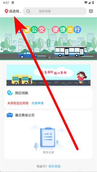 1、打开公交e出行,点击页面左上角请选择,完成城市选择设置。