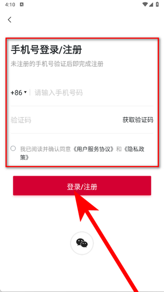 4、输入手机号码,点击获取验证码,输入收到的验证码,勾选后,点击登录注册按钮,完成注册操作。