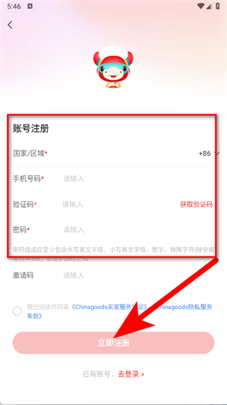 4、依次输入手机号码,点击获取验证码等信息,点击立即注册按钮,完成账号注册。