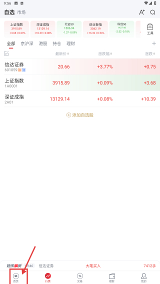 1、打开证券类应用,点击底部首页选项,进入首页功能页面。