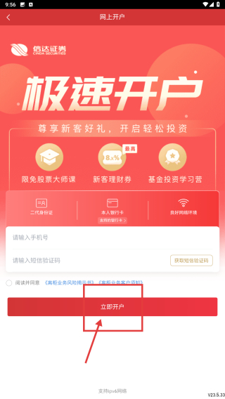 4、在网上开户界面,输入手机号、获取并填写短信验证码后,点击立即开户按钮,完成证券账户开户操作。