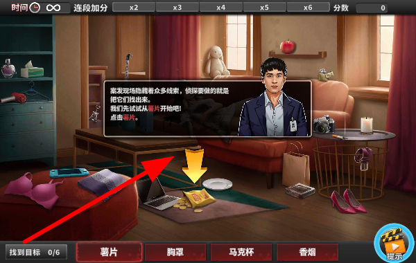 1、在案发现场,根据提示寻找目标物品,比如薯片,仔细观察场景中的各个角落,找到后点击获取分数。