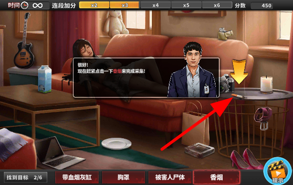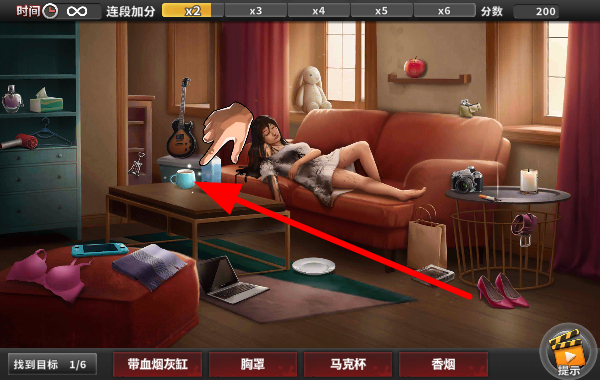 3、按照指引,在场景中精准点击对应的物品,如马克杯、带血烟灰缸等,成功找到后会获得相应的分数奖励。
