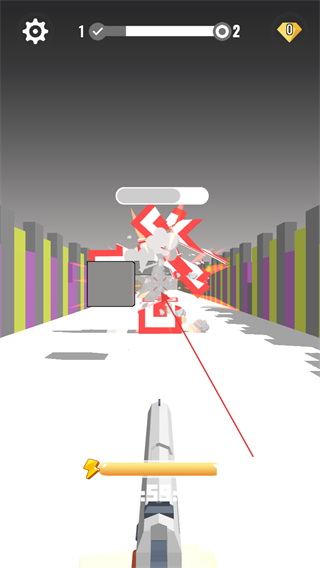 1、操控枪械瞄准前方红色方块射击,击碎方块推进游戏。