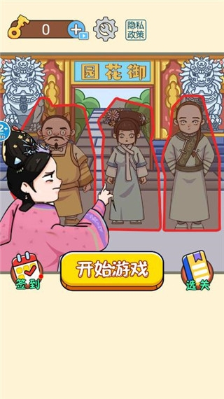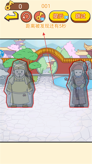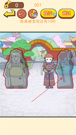 1、进入游戏关卡,留意距离被发现还有10秒倒计时,快速选择躲藏位置,比如躲到石像后。