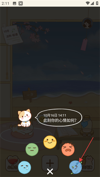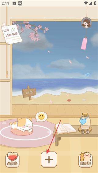 1、进入心岛日记主界面,点击底部+按钮,进入心情选择页面。