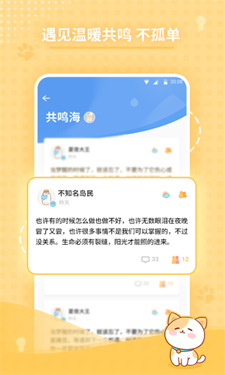 允许用户公布生活动态,分享心情点滴,其他用户可看到并互动,通过共同的情绪或经历偶遇小伙伴,打破独自记录的孤单,形成温暖的交流氛围。