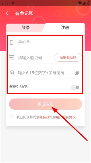 4、输入手机号、验证码,点击完成注册,完成注册操作。