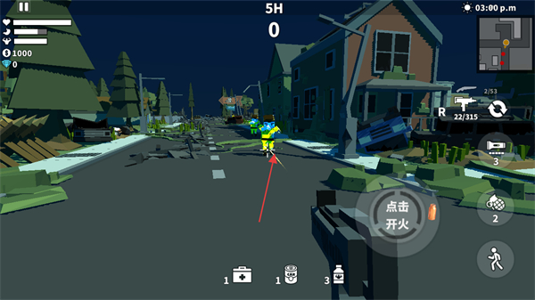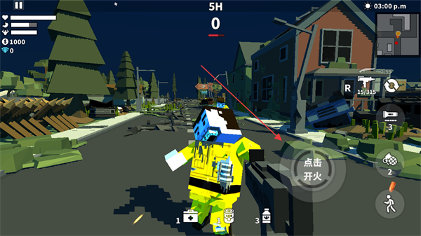 3、遭遇敌人如穿着防护服的僵尸时,点击屏幕右侧点击开火按钮攻击敌人。