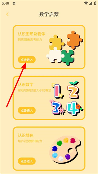 2、在数学启蒙页面,点击认识图形及物体下方的点击进入,进入认识图形页面。