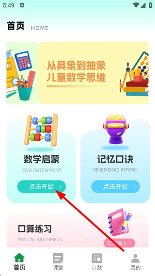 1、在APP首页,点击数学启蒙下方的点击开始,进入数学启蒙页面。