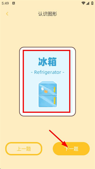 3、在认识图形页面,可查看图形相关内容,点击下一题可查看下一个图形内容。