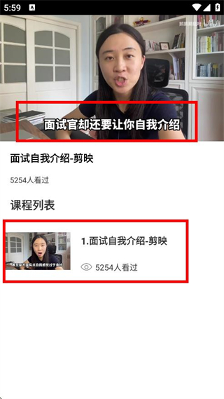 4、在视频播放页面,可观看“面试官却还要让你自我介绍”等相关面试分享视频及课程。