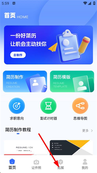 1、在求职类APP首页,点击底部拓展,进入拓展页面。