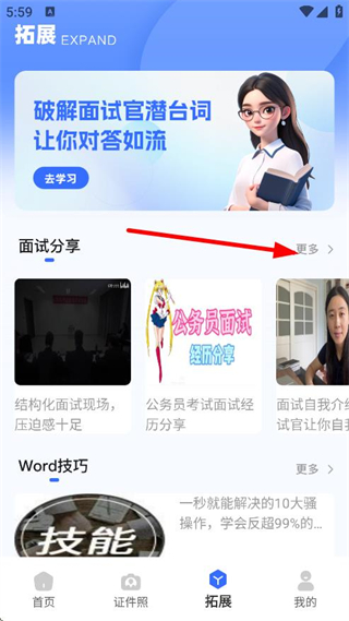 2、在拓展页面,点击面试分享处的更多,进入更多面试分享内容页面。