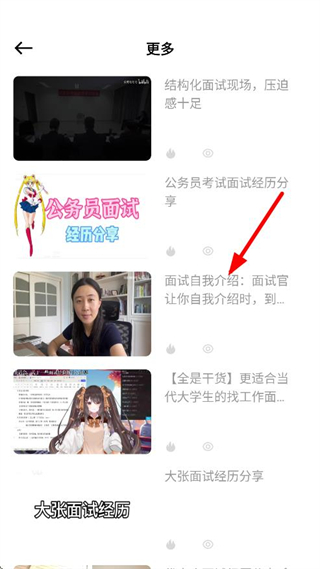 3、在更多面试分享内容页面,选择感兴趣的面试分享视频,进入视频播放页面。